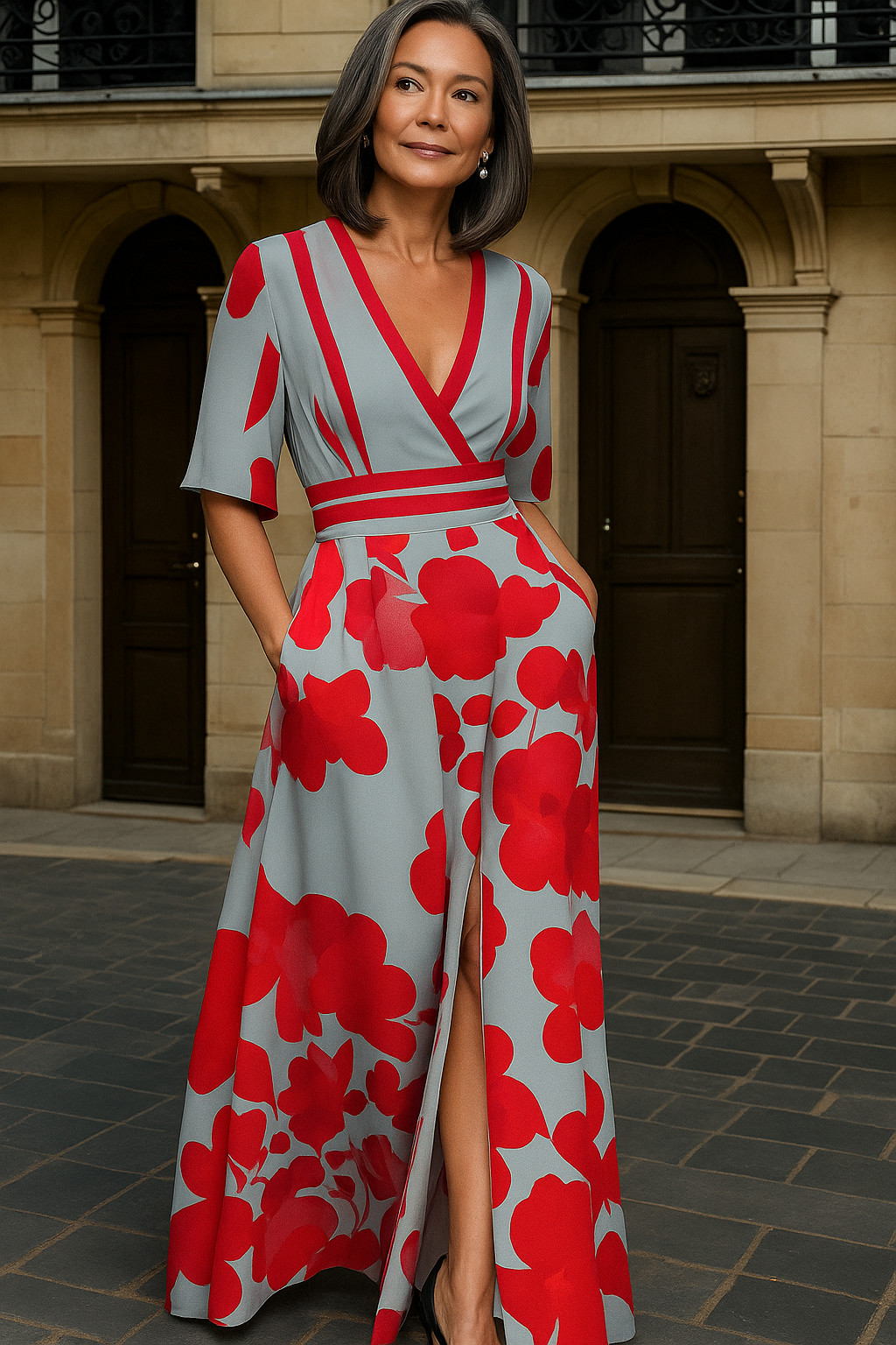 A modern take on classic tailoring, the Emily Milano midi pairs a soft V-neck and waist-defining bands with a flowing A-line skirt. The dove-grey base is printed with vibrant red florals, creating a confident look that moves easily from daytime to dinner.
